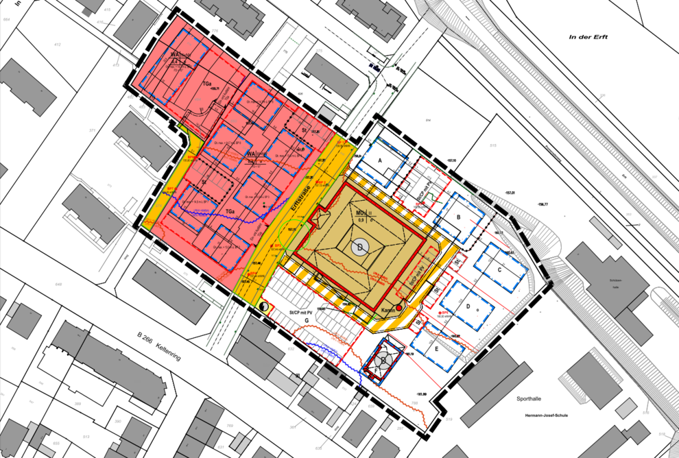 Die EUGEBAU erwarb 2017 das im Jahr 1903 errichtete, denkmalgeschützte Gebäude „Alter Schlachthof - Euskirchen“ und die umliegenden Grundstücke (rot umrandet). Im Jahr 2026 erwarb sie ein weiteres Grundstück, sodass nun das gesamte Quartier "Alter Schlachthof" (schwarz umrandet) im Eigentum der EUGEBAU steht.